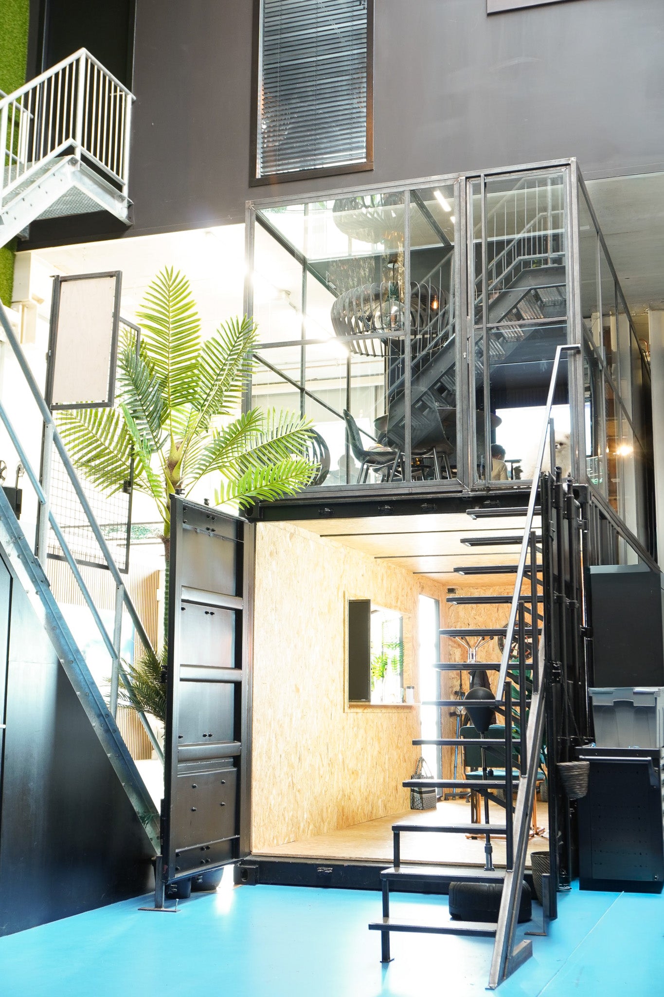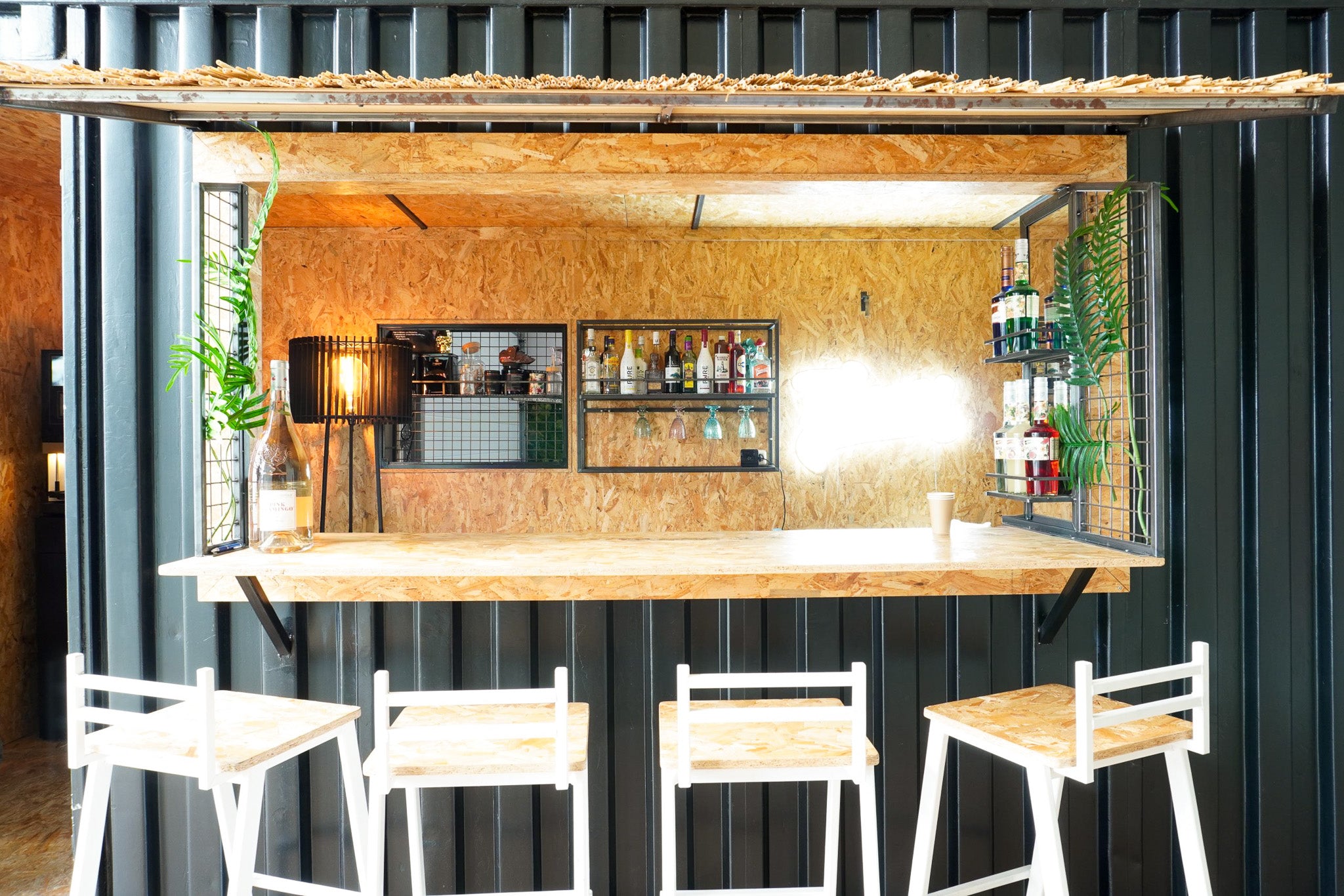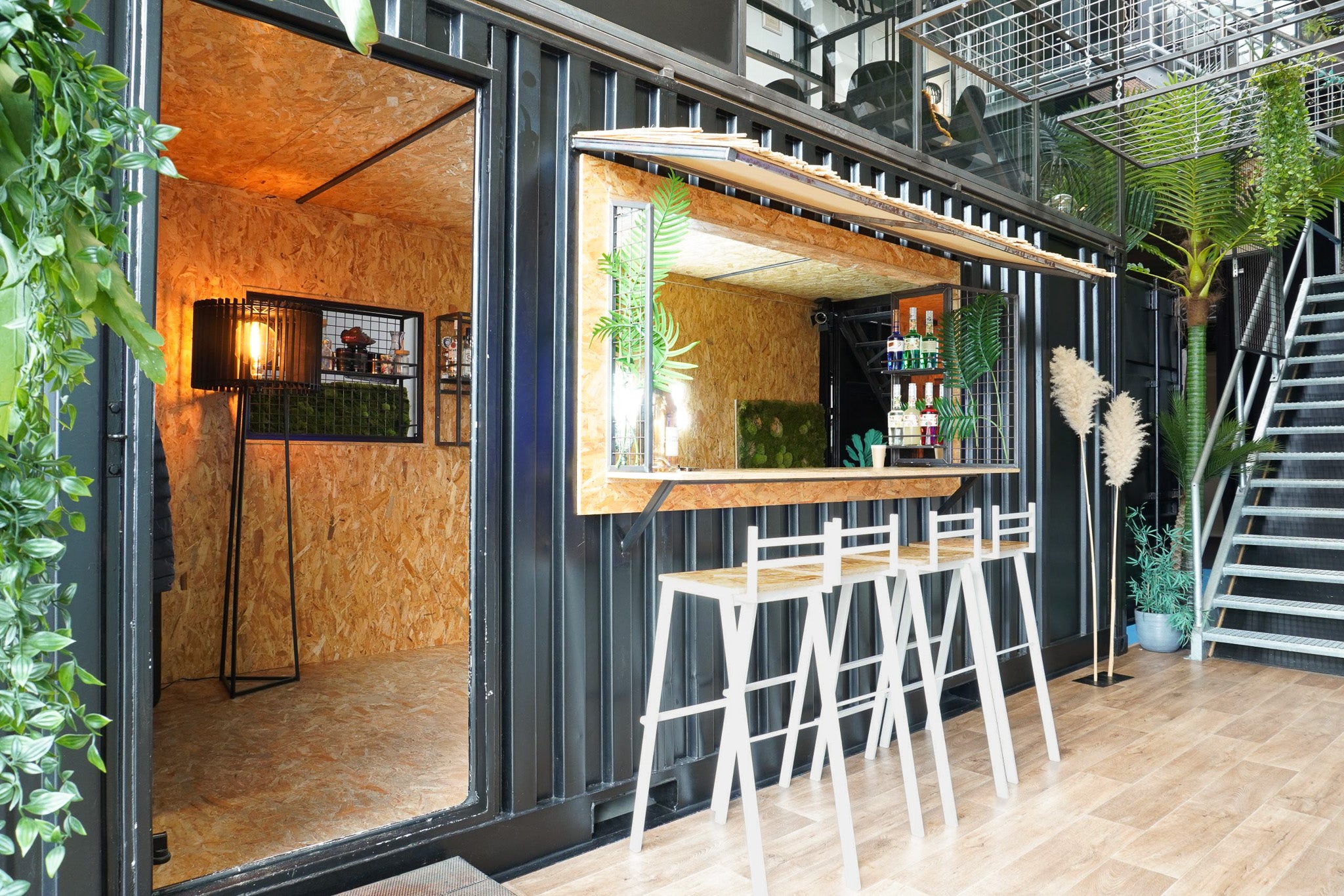 Dit zie je niet elke dag! Bij film agency Famoz! spat de creativiteit er af en daar hoort een indrukwekkende entree bij. We krijgen bij elk project ontzettend veel vrijheid dat maakt het echt heel leuk! Op de zeecontainer maakten we een glazen kantoor, de editing room. Een zwevende trap brengt je boven. De slijptol ging in zeecontainer en daar kwam de beach bar. Proost met een lekker drankje op de lifeguard barkrukken.
