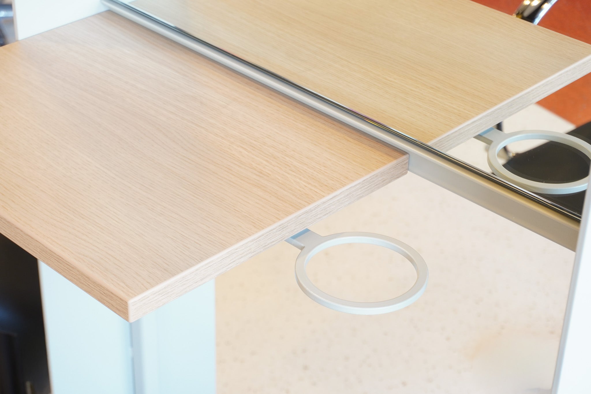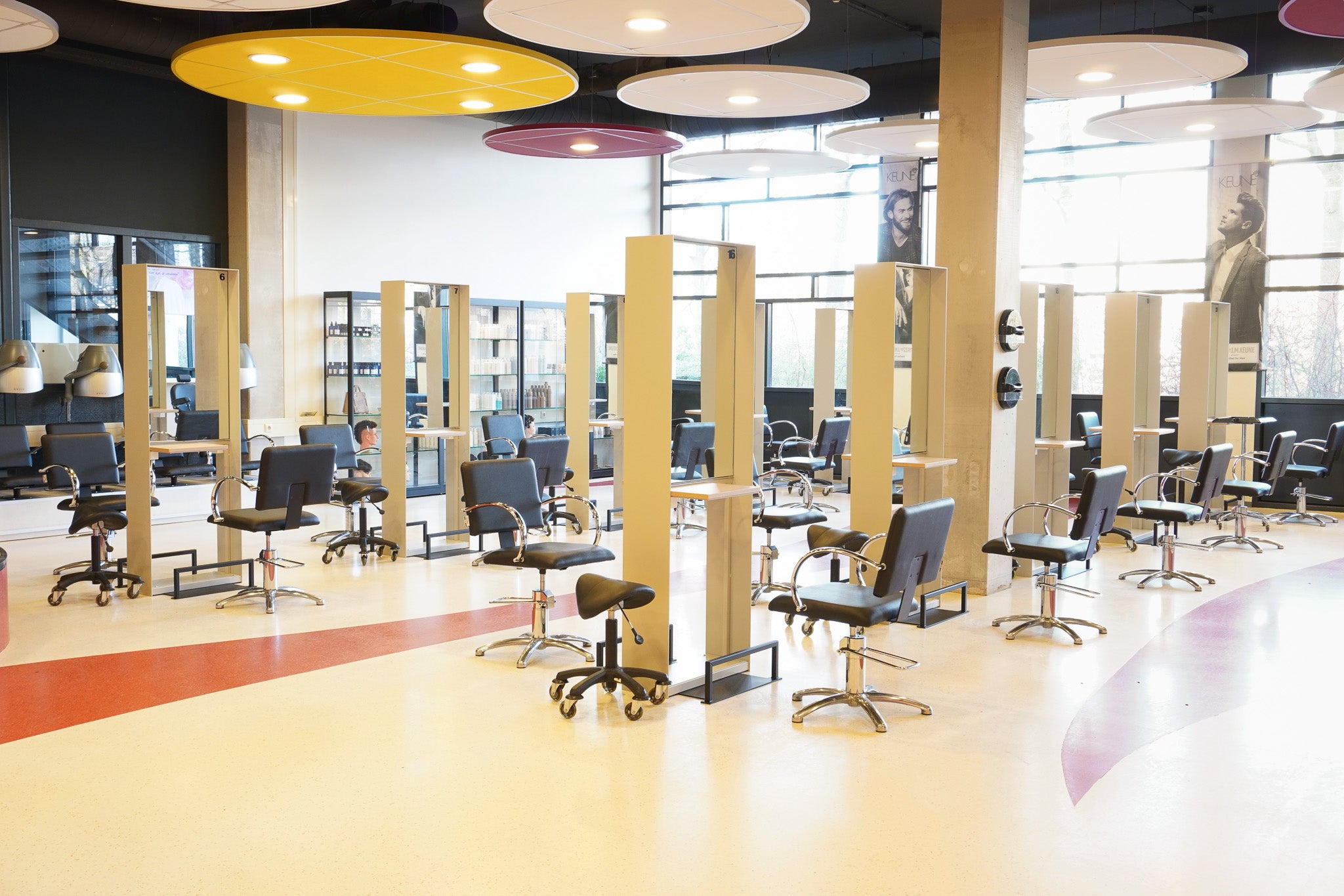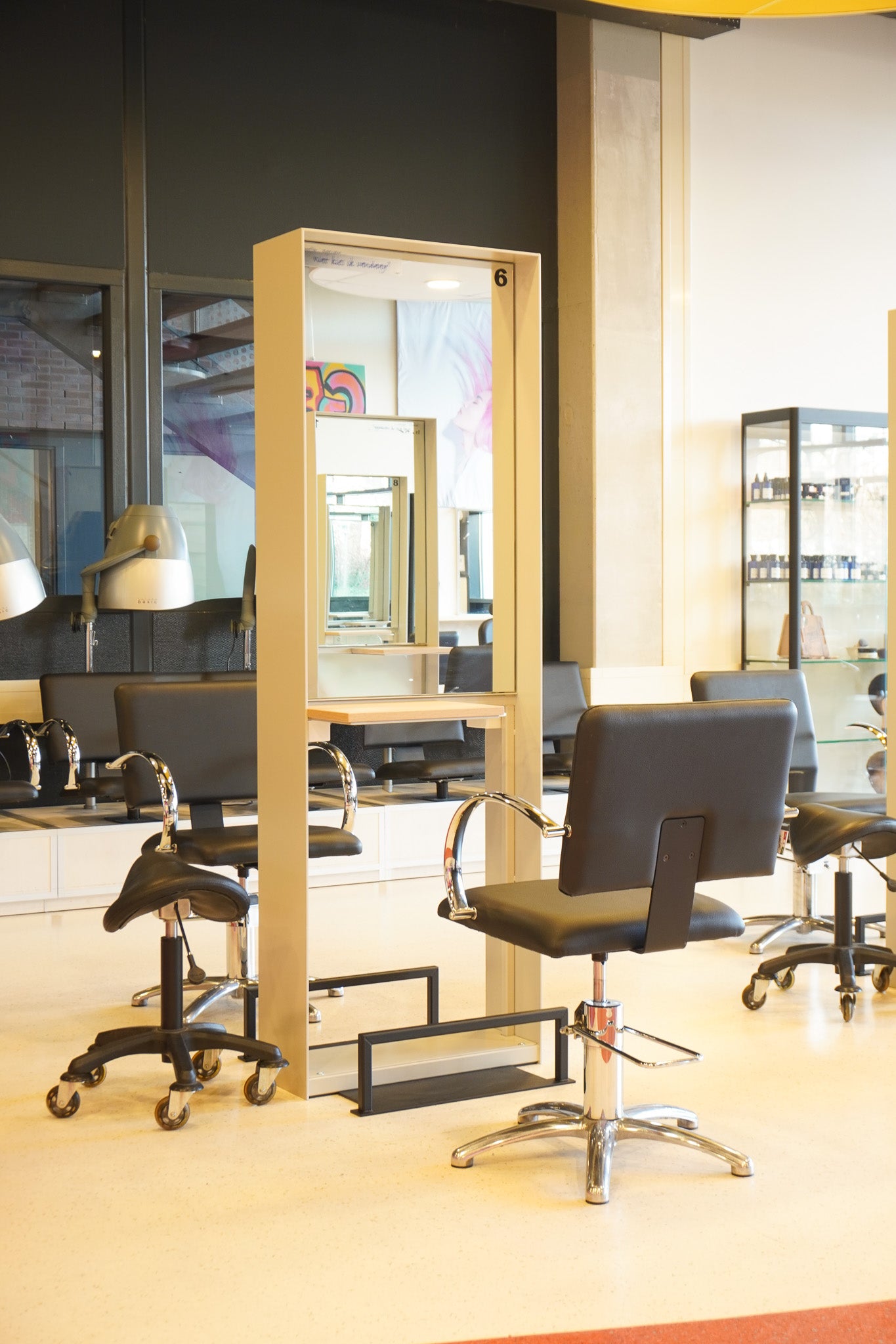 Voor ROC Firda deden wij het ontwerp, de productie en staken het hele lokaal in een nieuw jasje. We mikten op een chic meubel en een gezelliger lokaal. Elk meubel geeft plek voor twee studenten. Ook is het meubel voorzien van twee stopcontacten die verfijnd zijn weggewerkt. Leuk details is dat we alle spiegels hebben hergebruikt, lekker duurzaam.