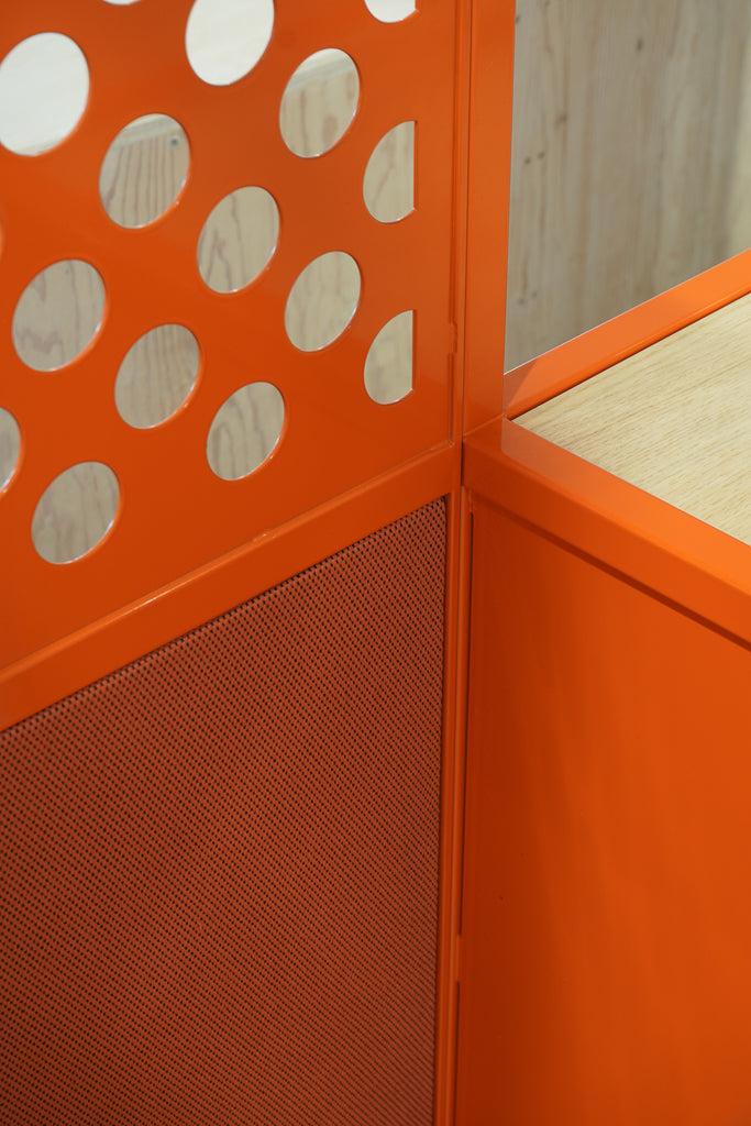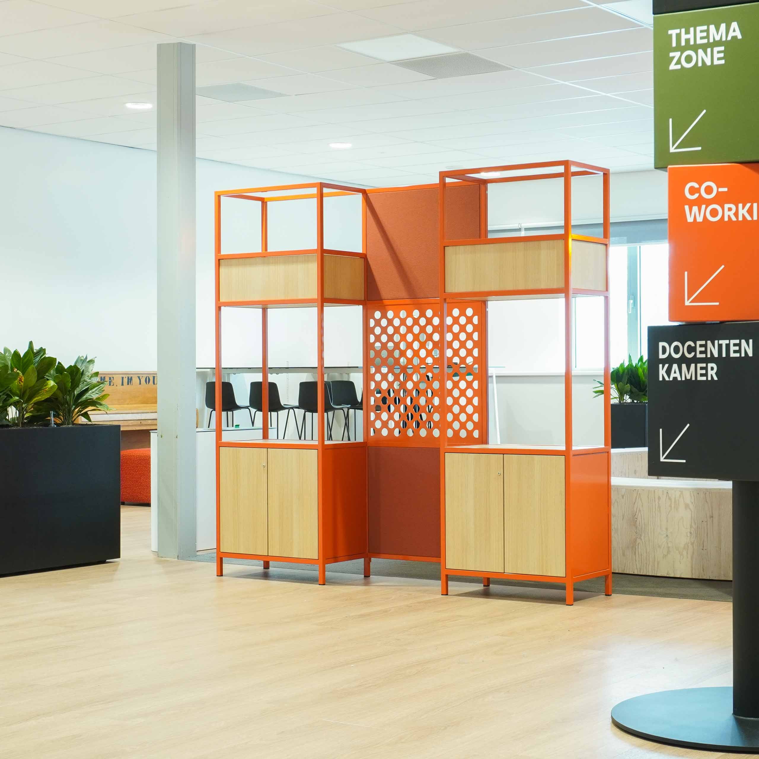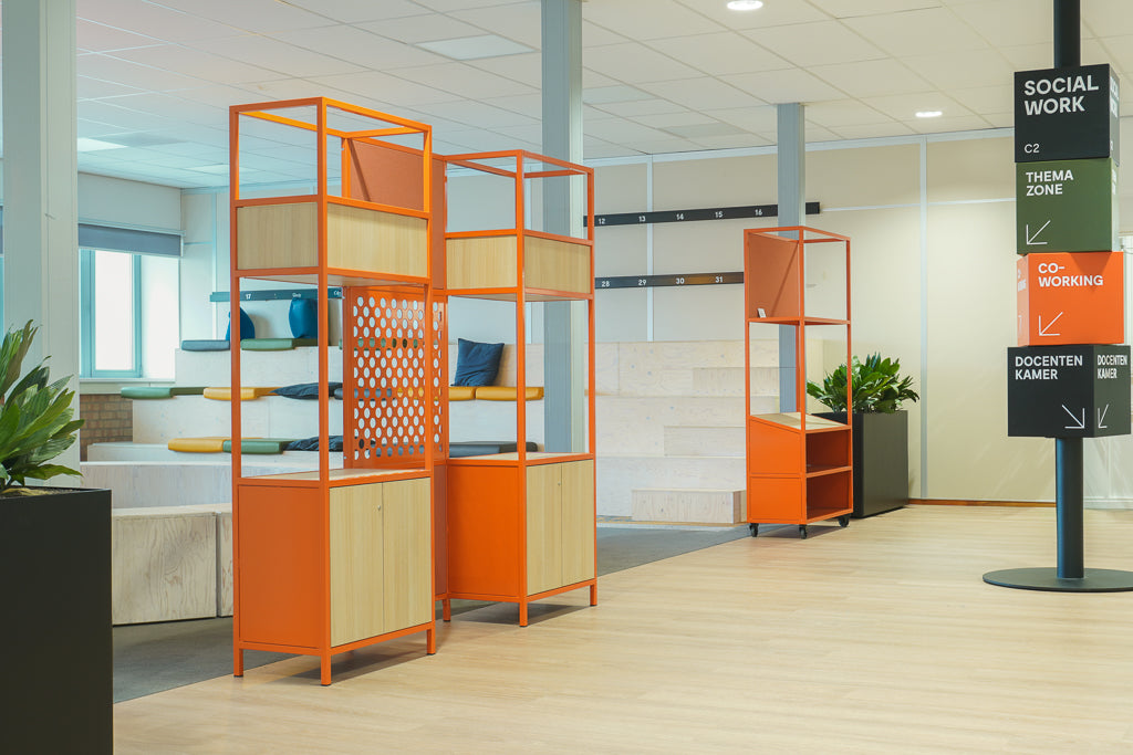 Naar een ontwerp van Buro Marie maakten wij voor de afdeling Social Work deze roomdivider en rolkast. Een strakke afwerking, weinig toleranties en verschillende materialen maakten dit project een leuke uitdaging. Verborgen schroefverbindingen, ingekaderd strak gestoffeerde panelen en een lasergesneden plaat maakt de verbinding tussen beide kasten.